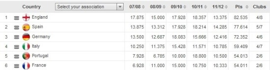 UEFA에 소속된 너라, 클럽들의 계수를